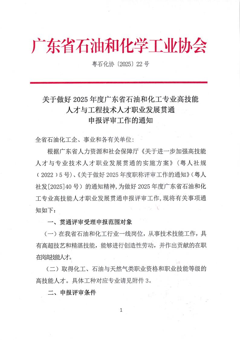 关于做好2025年度广东省石油和化工专业高技能人才与工程技术人才职业发展贯通申报评审工作的通知(粤石协[2025] 22号)