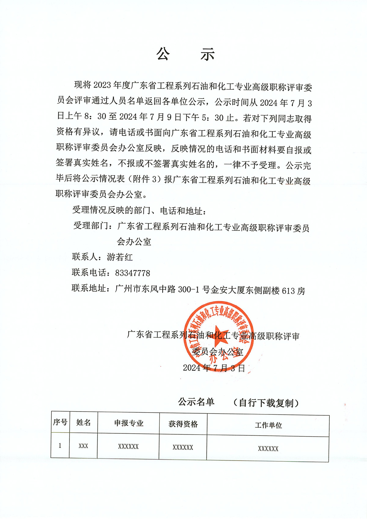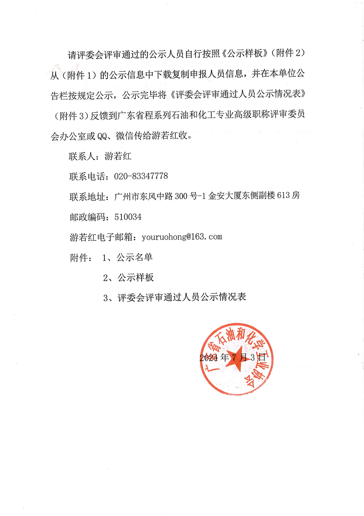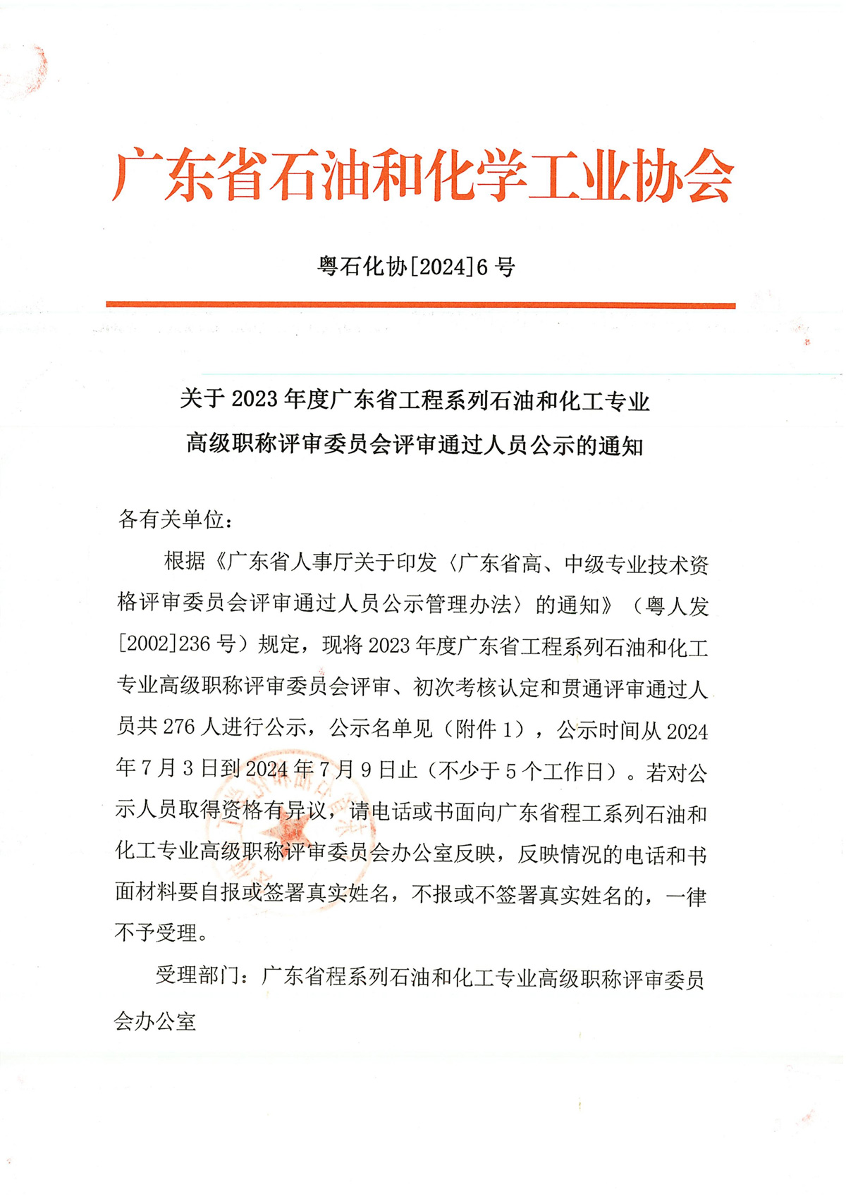 2023年度广东省工程系列石油和化工专业高级职称评审委员会评审通过人员公示的通知(粤石化协[2024] 6 号)